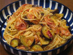 ナスとベーコンのスパゲティです。 材料: ナス ベーコン トマトソース ①ニンニクを潰してたっぷりのオリーブオイルで香りを出す。 ②ベーコンを入れ、一口大に切ったナスを炒める。 ③ナスに火が通ったら、トマトソースを入れる。温まればOK。 ④茹でたスパゲティーをソースの中に入れて絡めて盛り付けて。上からかけるより絡めてあげた方が美味しいのです。 PR |