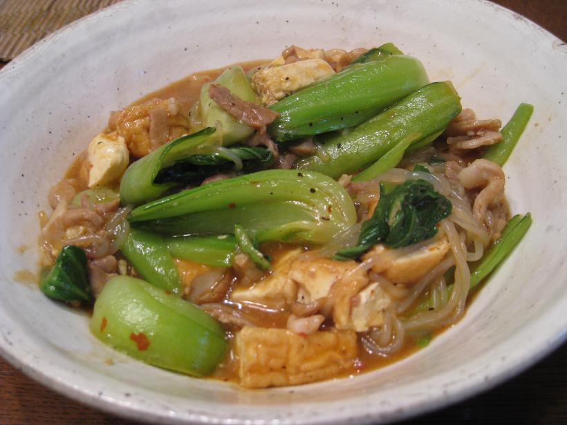 ⑤チンゲン菜、厚揚げ、白滝を入れ、強火で火を通す。コショウを少々