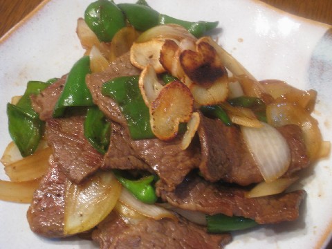 ②牛肉を強火でさっと炒めます。半分くらい火が通ったところで、一度上げちゃいます。余分な油・脂をさっとふき取ります。少しくらい油・脂が残っているくらいがいいです。