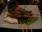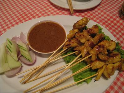 鶏肉と牛肉のサテがあります。串焼きですね。それにピーナッツソースをつけて食べます。