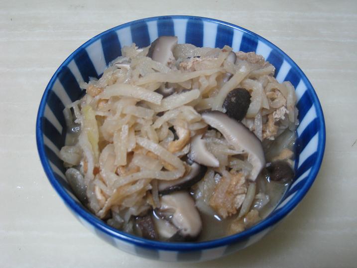 ②切干大根は袋に表示してある通りに戻してください。大概はよく洗ってから、水に入れて15-20分戻してくださいとある気がする。戻した水は捨てないでね。ダシ汁として使います。